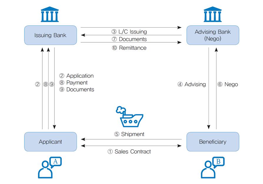 - 신용장 신청 : Applicant(수입자) → Issuing Bank (개설은행)